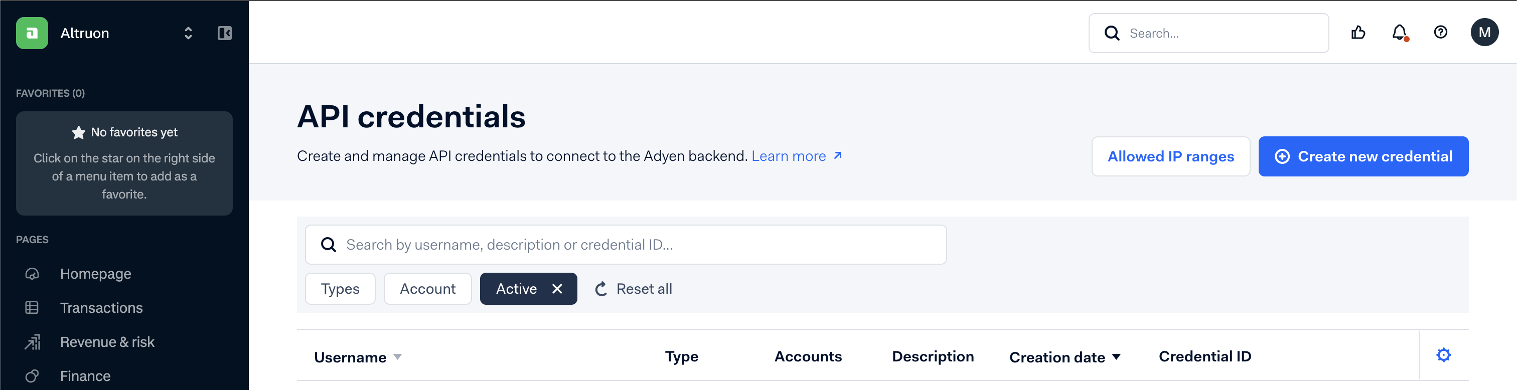If the connection is successful, you will see the Adyen integration marked as Active in Altruon.